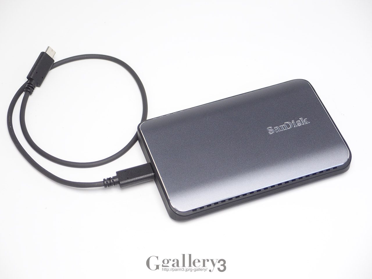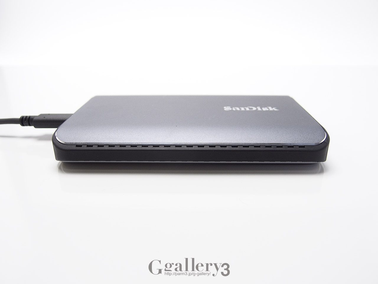 今回RAIDの導入は見送りにして、代わりに導入したのがSanDisk Extreme 900 1.92TBです。渋いグレーの筐体は蝋引きしたようなしっとりとした表面加工に若干浮かせたSanDiskロゴが中々の高級感です。横に開けられたラジエターを兼ねた空気抗、筐体の周囲に施されたゴム製クッションもヌメッとした手触りがいい感じです。